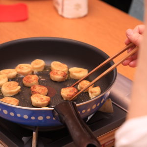 | 10 中強火にかけ、カリッと焼けたらひっくり返して焼く。 |